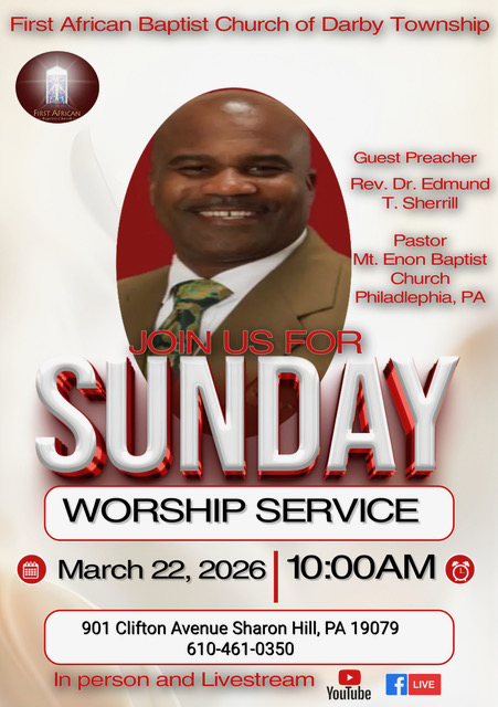We are very pleased that you decided to visit the website of First African Baptist Church of Sharon Hill, PA. First African is a family-oriented church for all of the Lord’s children regardless of race, color, creed, or circumstance. If you have never experienced the JOY! of First African, I sincerely ask you to join us for Sunday morning worship service. If you have visited previously and are looking for a church home, please accept an invitation to become part of our Christian fellowship on Sunday morning.