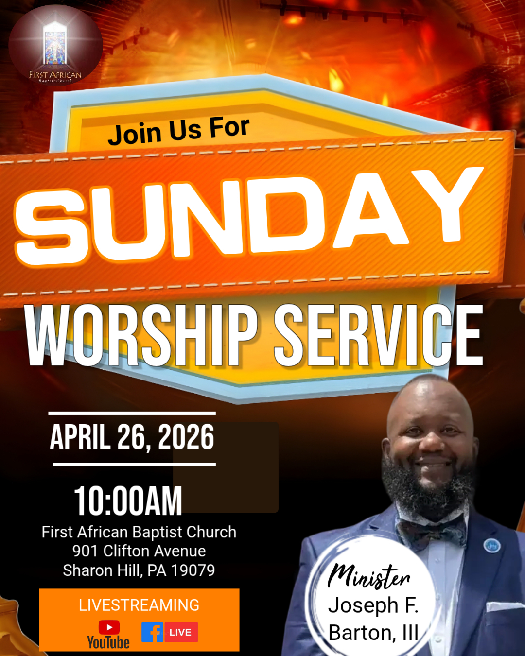 We are very pleased that you decided to visit the website of First African Baptist Church of Sharon Hill, PA. First African is a family-oriented church for all of the Lord’s children regardless of race, color, creed, or circumstance. If you have never experienced the JOY! of First African, I sincerely ask you to join us for Sunday morning worship service. If you have visited previously and are looking for a church home, please accept an invitation to become part of our Christian fellowship on Sunday morning.
